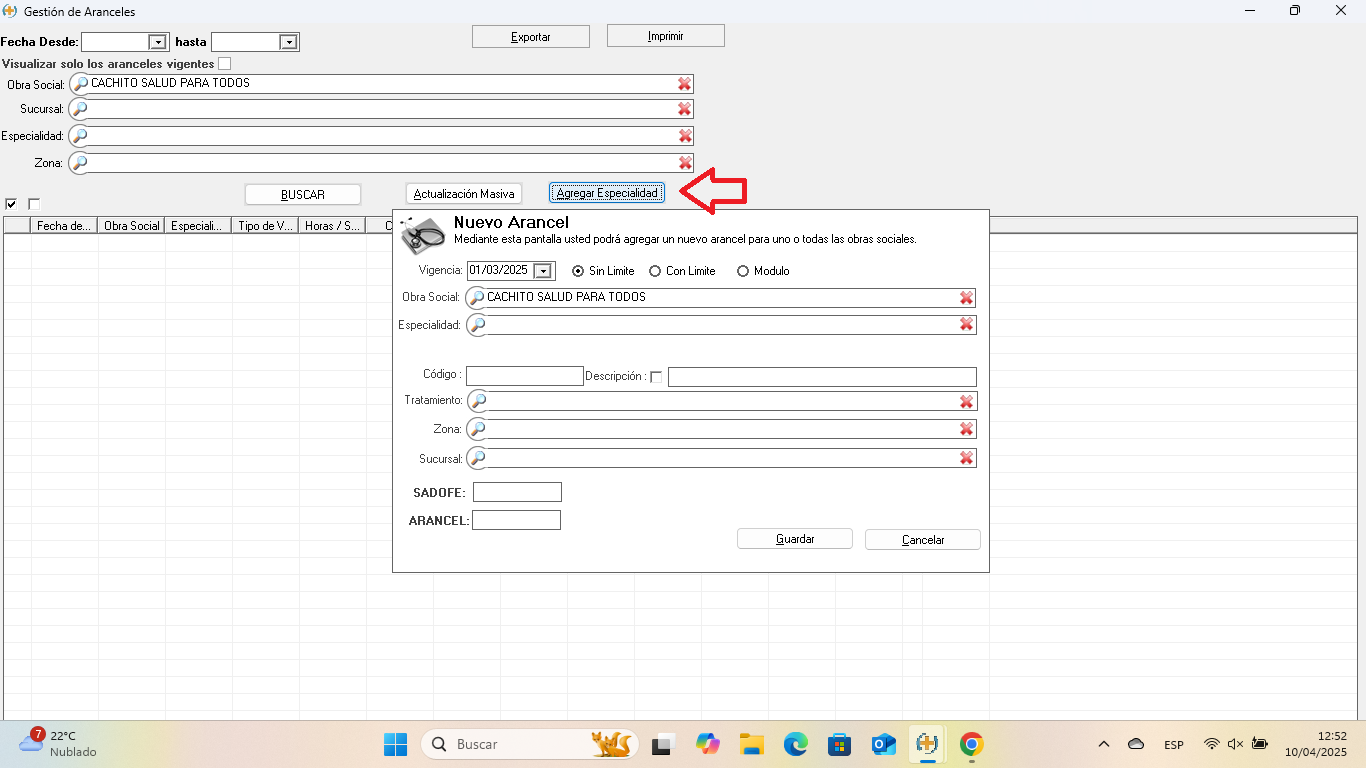Con la Obra Social seleccionada, hacer clic en el botón "Agregar Especialidad". Se abrirá la ventana Nuevo Arancel.