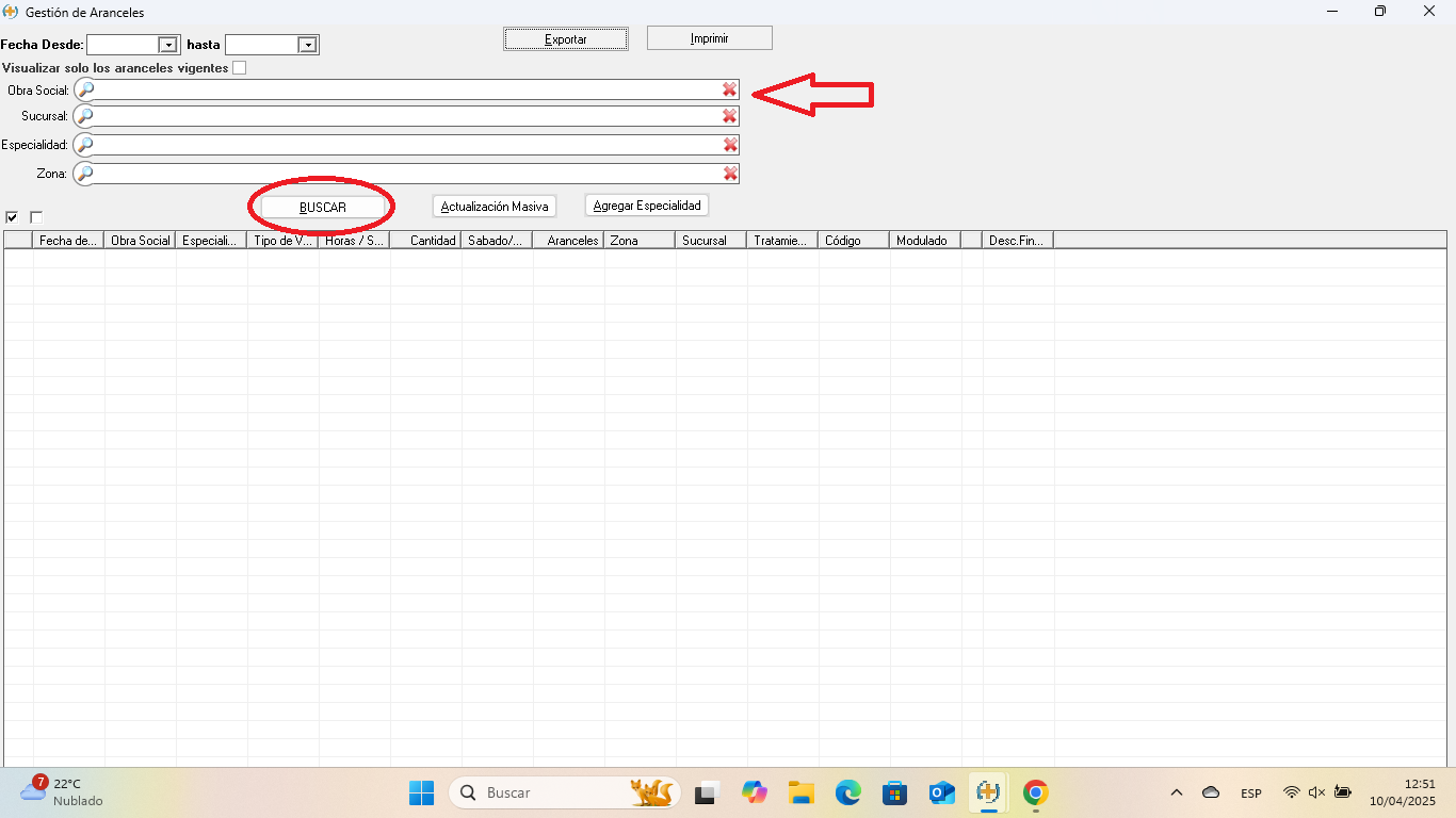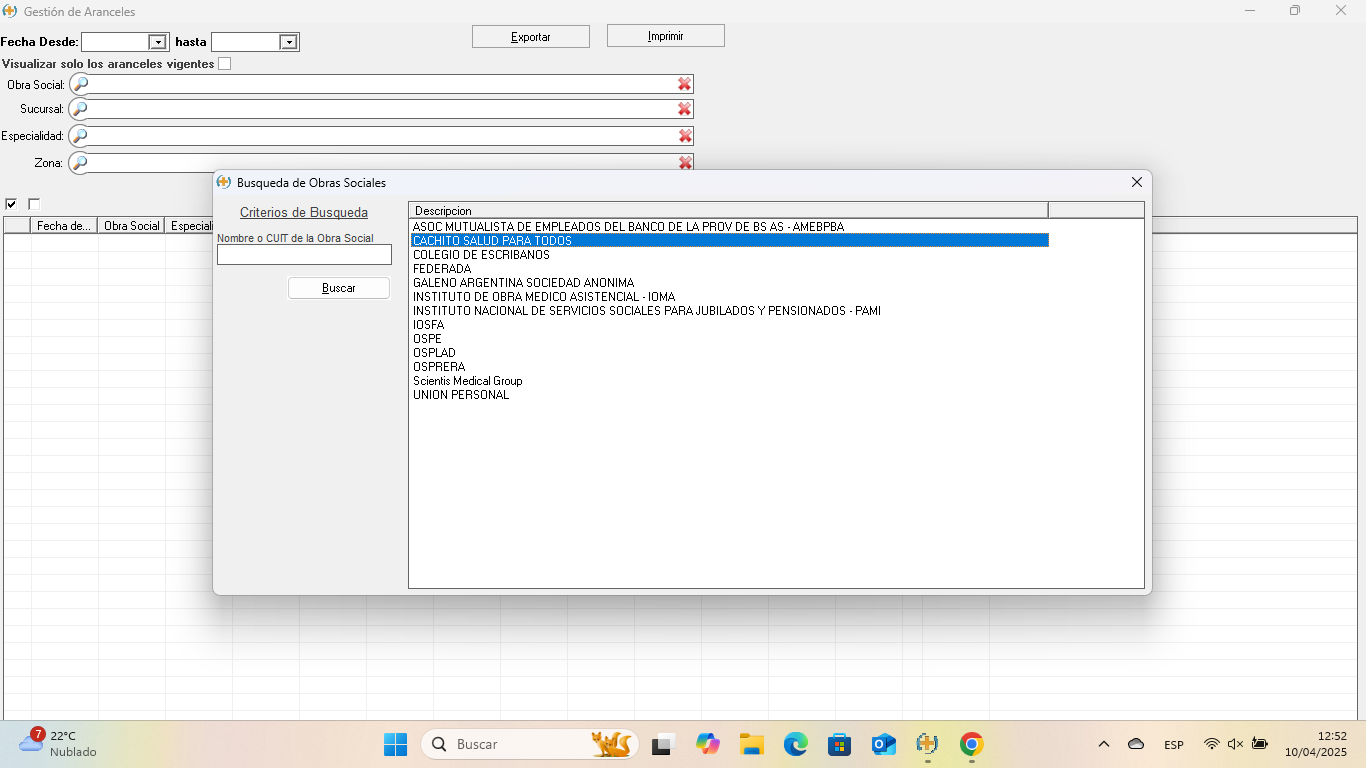 Se abre la ventana de Gestión de Aranceles. Para seleccionar la Obra Social, hacer clic en la lupa del campo Obra Social y elegirla de la lista, o escribir el nombre directamente en el campo y hacer clic en Buscar.