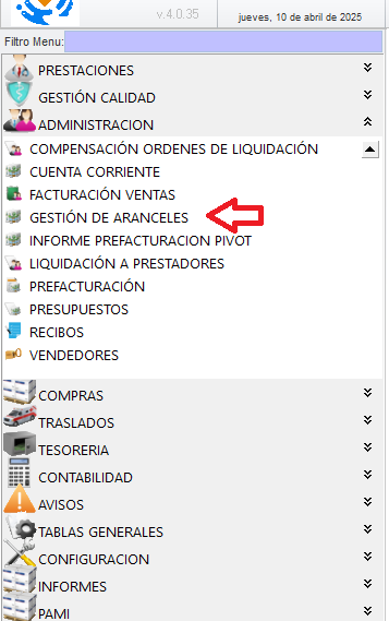 Ingresar al menú ADMINISTRACIÓN → GESTIÓN DE ARANCELES.