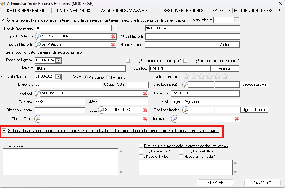 Usar esta opción cuando se decida que un prestador no debe seguir trabajando con la empresa, por ejemplo porque se lo quiere dejar inactivo o en una “lista negra” interna para evitar futuras asignaciones.