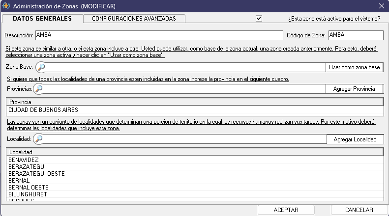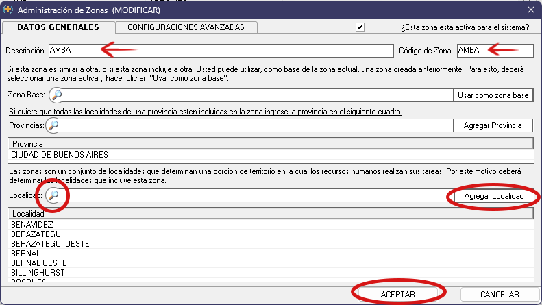Para agregar más localidades, repetir desde el punto 5 hasta cargar todas las localidades que conforman la Zona.