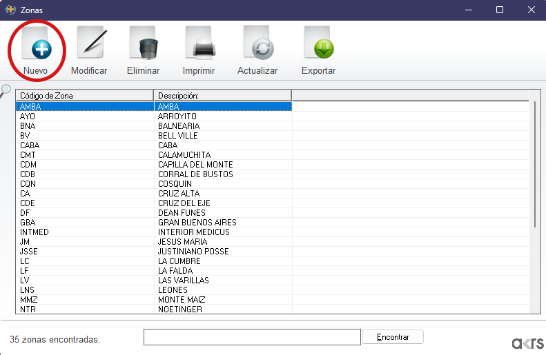 Elegir la localidad correspondiente haciendo doble click o presionando Enter. Se cerrará la ventana ‘Búsqueda de Localidades’ y volverá la ventana ‘Administrador de Zonas’.