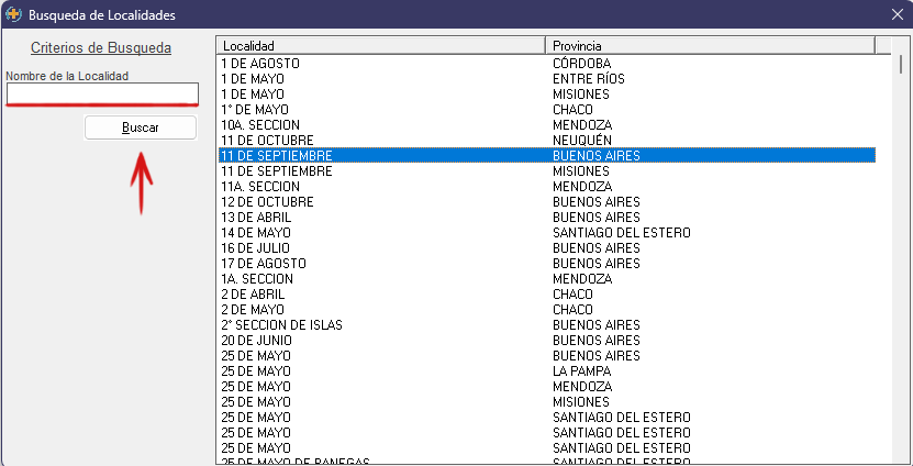Luego presionar la lupa en Localidad / Escribir la Localidad deseada en la casilla y presionar Enter. Se abrirá la siguiente ventana: