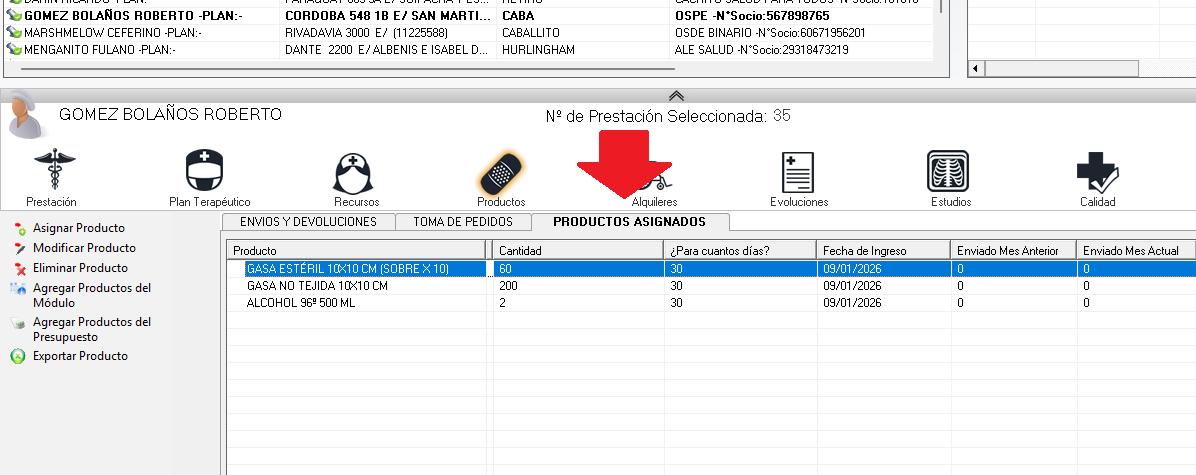 En la solapa “PRODUCTOS ASIGNADOS” se asignan productos que el paciente requerirá regularmente. Este listado de insumos y medicamentos se puede utilizar para filtros (En los Filtros del INTEGRADOR se pueden filtrar los pacientes con productos asignados), medio de consulta y como base para cargar masivamente pedidos y envíos de productos al paciente.