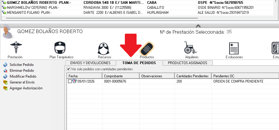 En la solapa “TOMA DE PEDIDOS” se generan las “Órdenes de entrega” o “Pedidos de Insumo” para el paciente. Se usa cuando un área de la empresa realiza la solicitud y otra área distinta se encarga de la gestión de envío y entrega. Cuando ambas funciones se realizan por una misma área, no se utiliza.