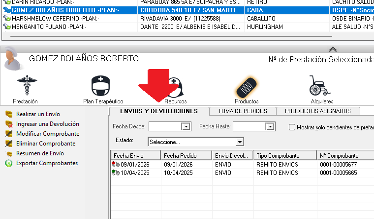 En la solapa “ENVÍOS Y DEVOLUCIONES” se generan los remitos que detallan los productos que se envían al domicilio y se registran las devoluciones.